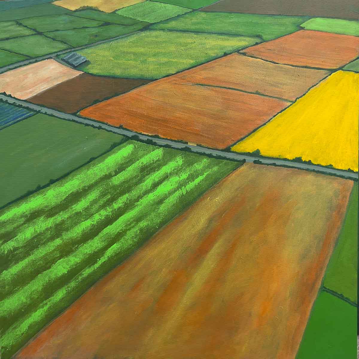 These paintings, inspired by aerial views, bring the intricate tapestry of landscapes to life showing the wonderful patchwork of fields.