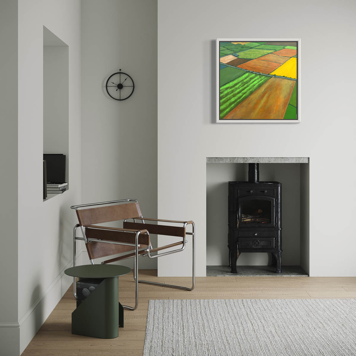 It is a celebration of the earth’s patchwork—its cultivated lands turned into something almost abstract yet deeply familiar. This artwork offers a glimpse into the harmonious blend of nature and human design, providing a peaceful yet thought-provoking experience that encourages reflection on the everyday splendours that surround us.