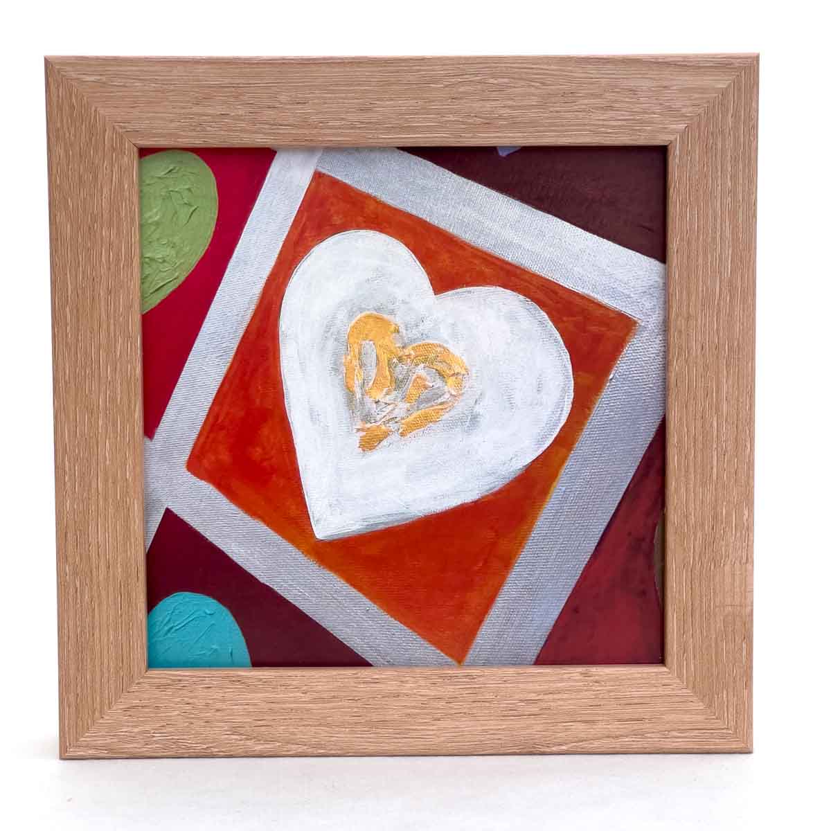 Love Heart is a vibrant 12cm art print set within a 16cm square frame (3cm deep), designed to hang on a wall or stand freely on a desk or shelf.