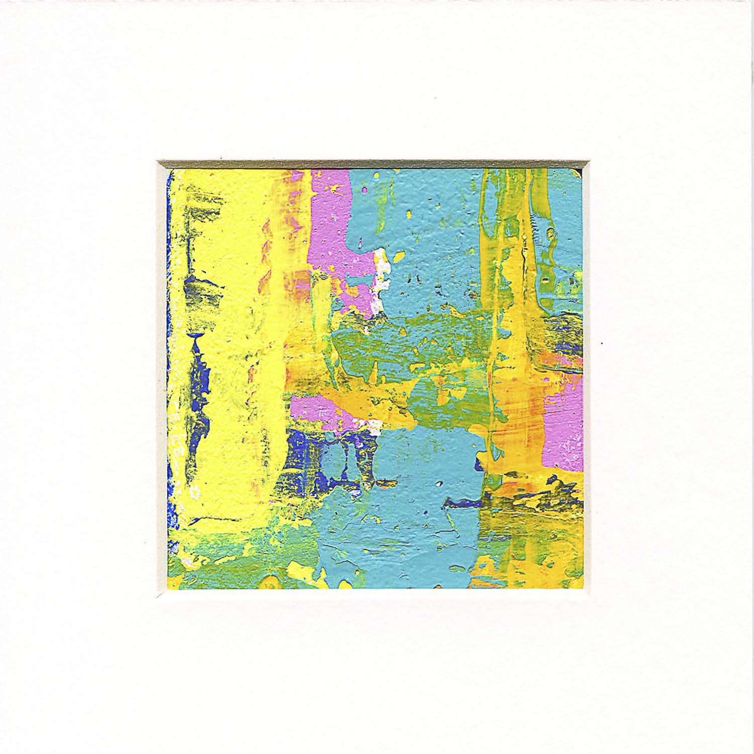 Turquoise and yellow dominate this vibrant composition, softened by accents of pink and hints of deep blue. Broad strokes and layered textures create a sense of openness and fluid rhythm, as if the colours are drifting and settling into balance. This miniature abstract captures the playful side of collective chemistry — where brightness, contrast, and harmony combine in equal measure.