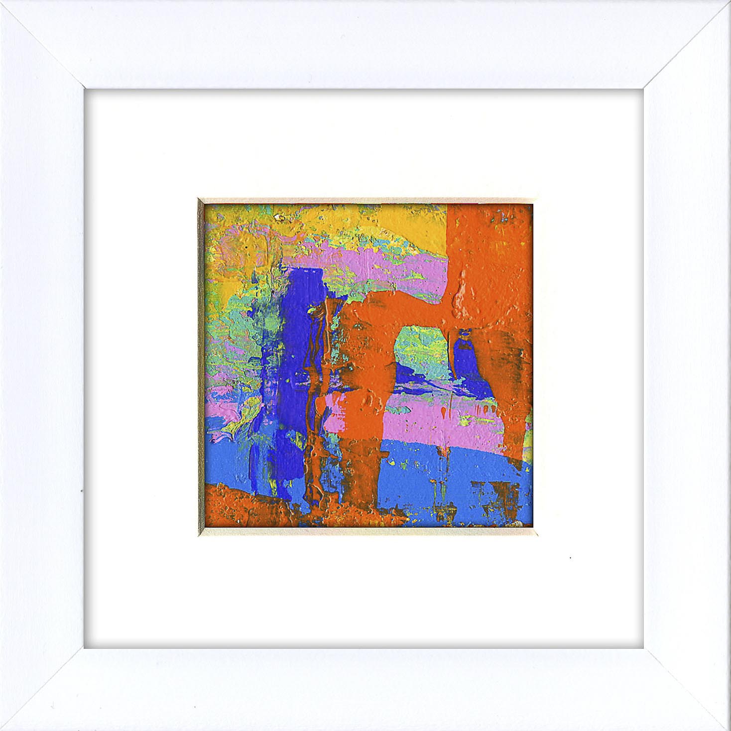Bright turquoise, orange, and yellow dominate this dynamic composition, offset by softer areas of pink and grounded by deep blue. Layers of colour cut across one another in bold strokes, creating a lively interplay of contrasts and textures. This miniature abstract embodies the spirited energy of collective chemistry — where vibrant forces meet, overlap, and resolve into a striking balance.