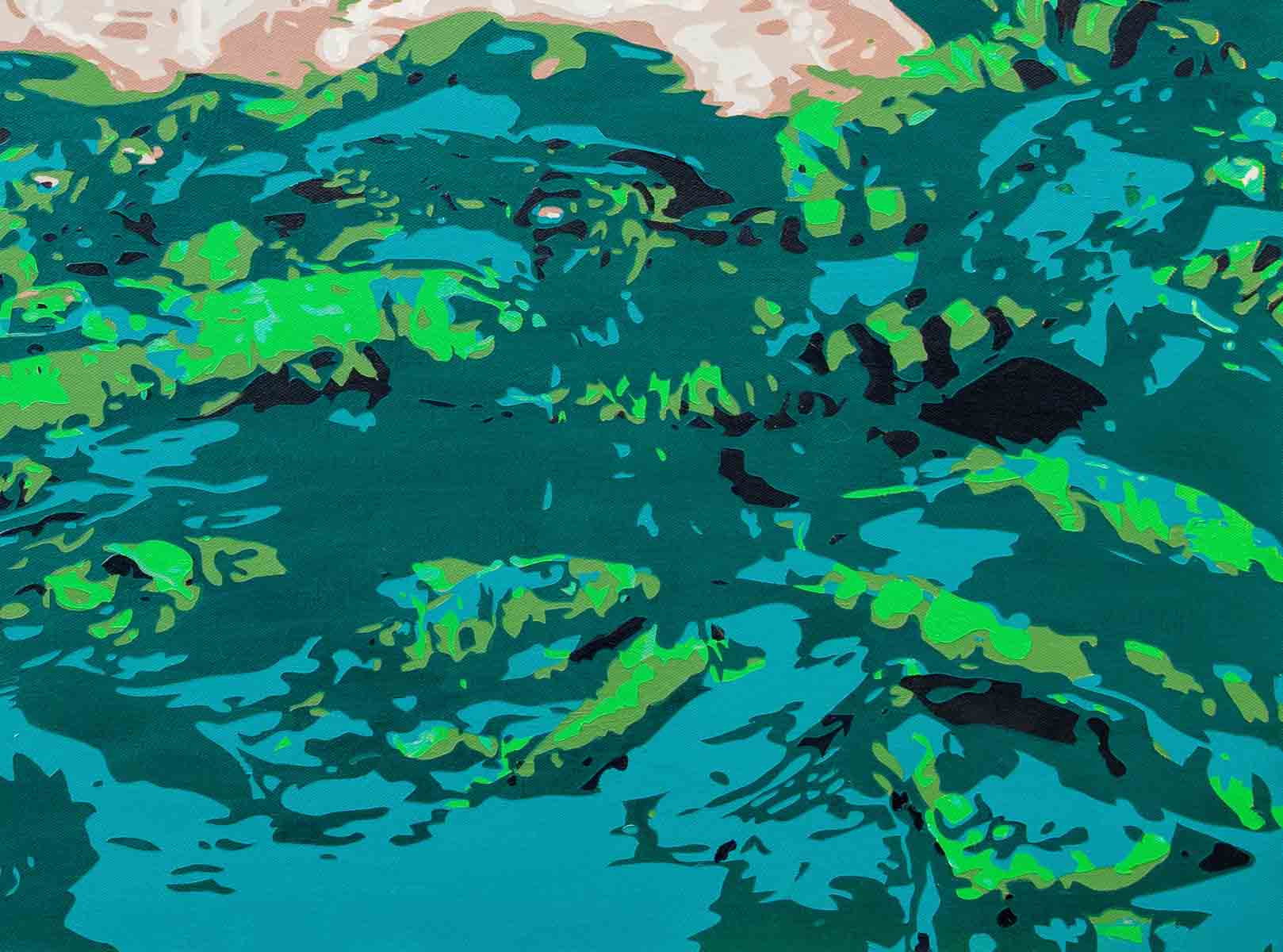 The water shimmers in lush shades of green, teal, and turquoise, with abstract reflections and movement suggesting warmth, energy, and immersion.