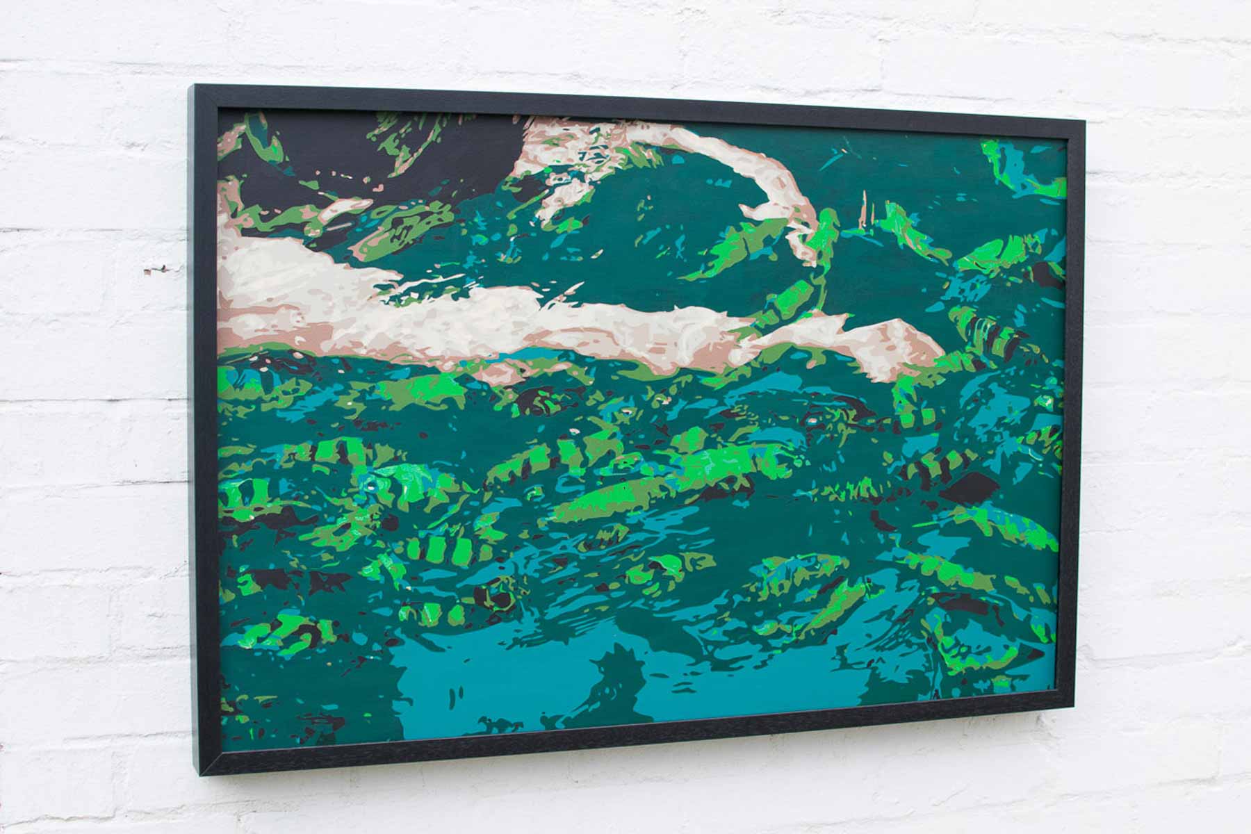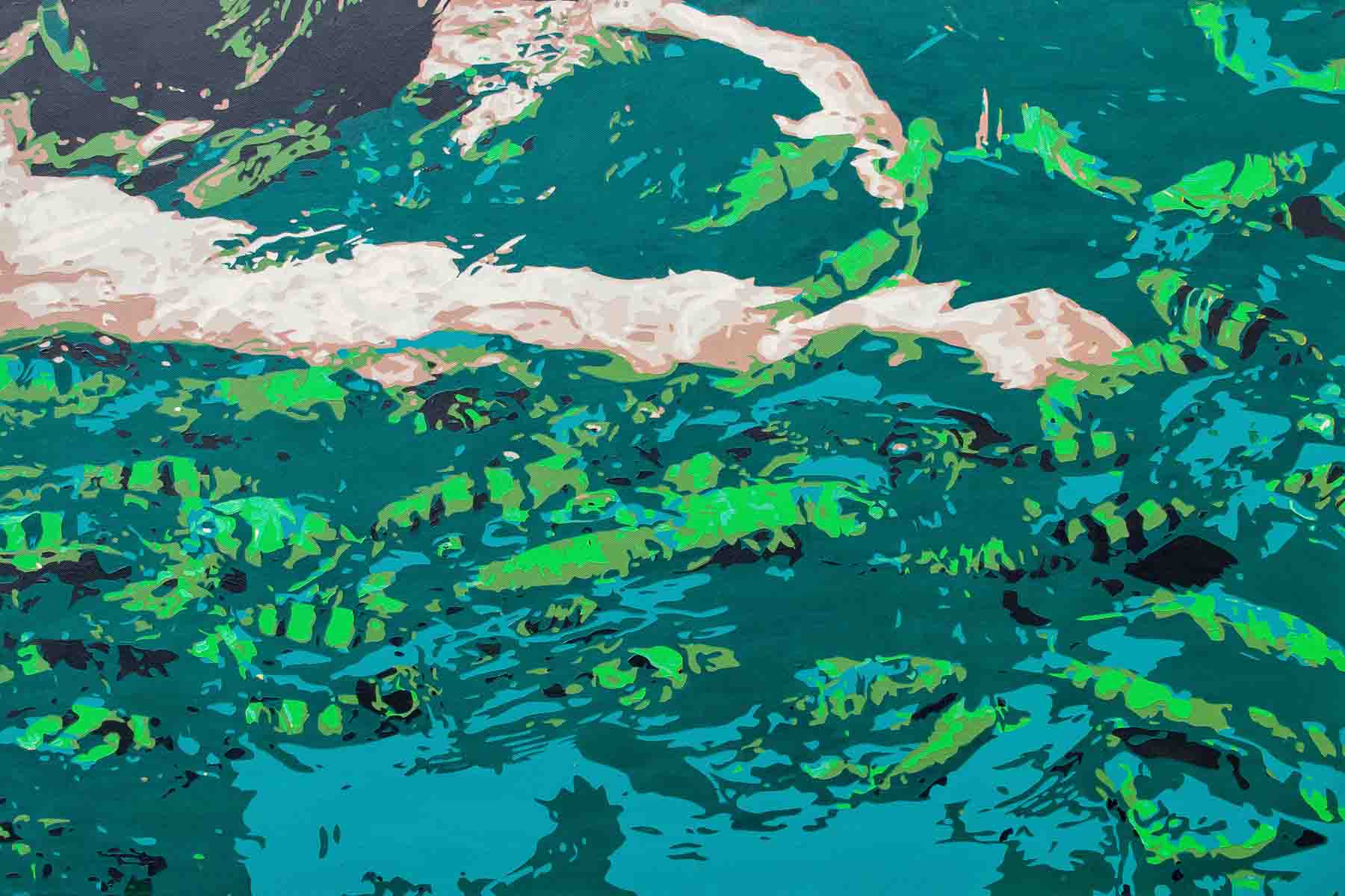 Emerald Sea is a vibrant figurative painting capturing the moment a boy swims among a school of strikingly patterned tropical fish.