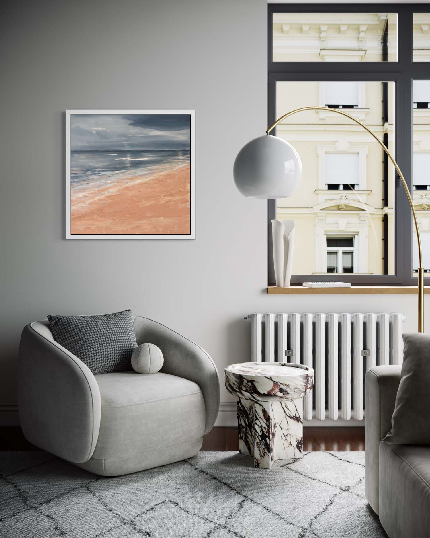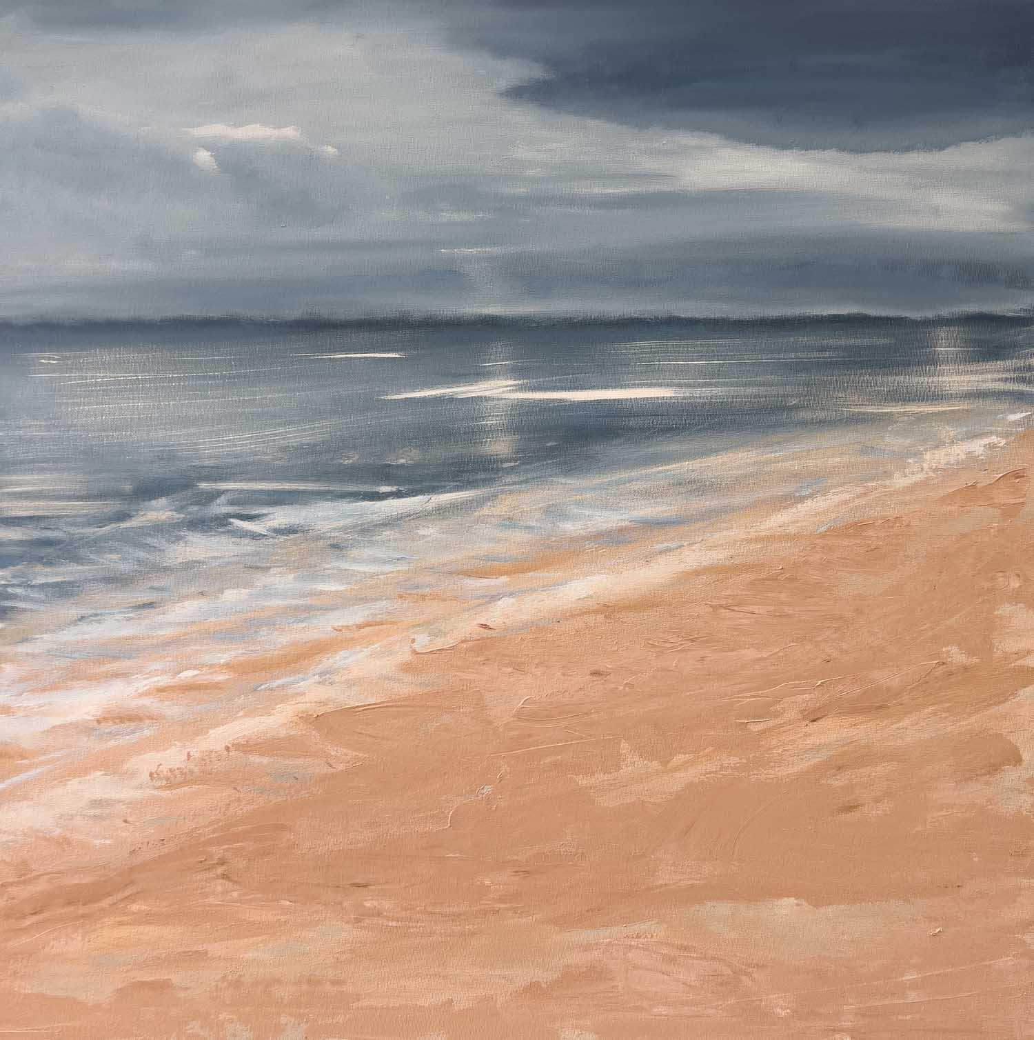 Dark clouds gather above a quiet expanse of sea, where light breaks through in shifting reflections across the water. The sandy foreground softens the drama, its textured warmth balancing the brooding sky. This painting captures a moment where light and shadow meet, creating a still and contemplative seascape.