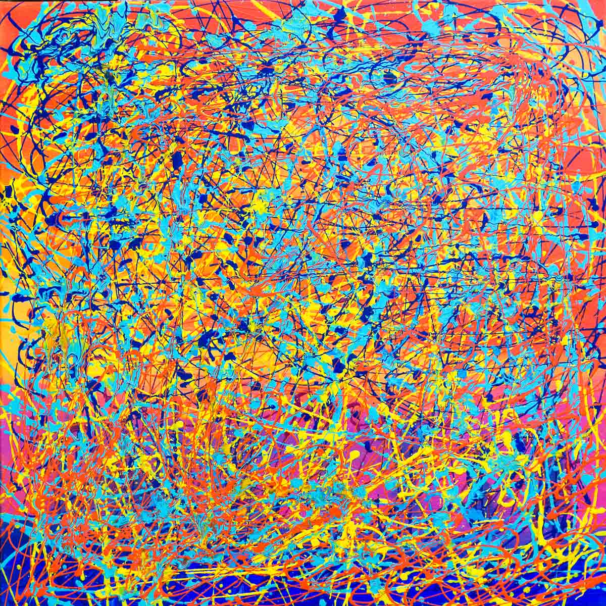 A multi-coloured dynamic type of painting that involves the deliberate application of considered sweeping brushstrokes and the accidental effects that occur from the gradual build up of dripping and pouring paint onto the canvas.