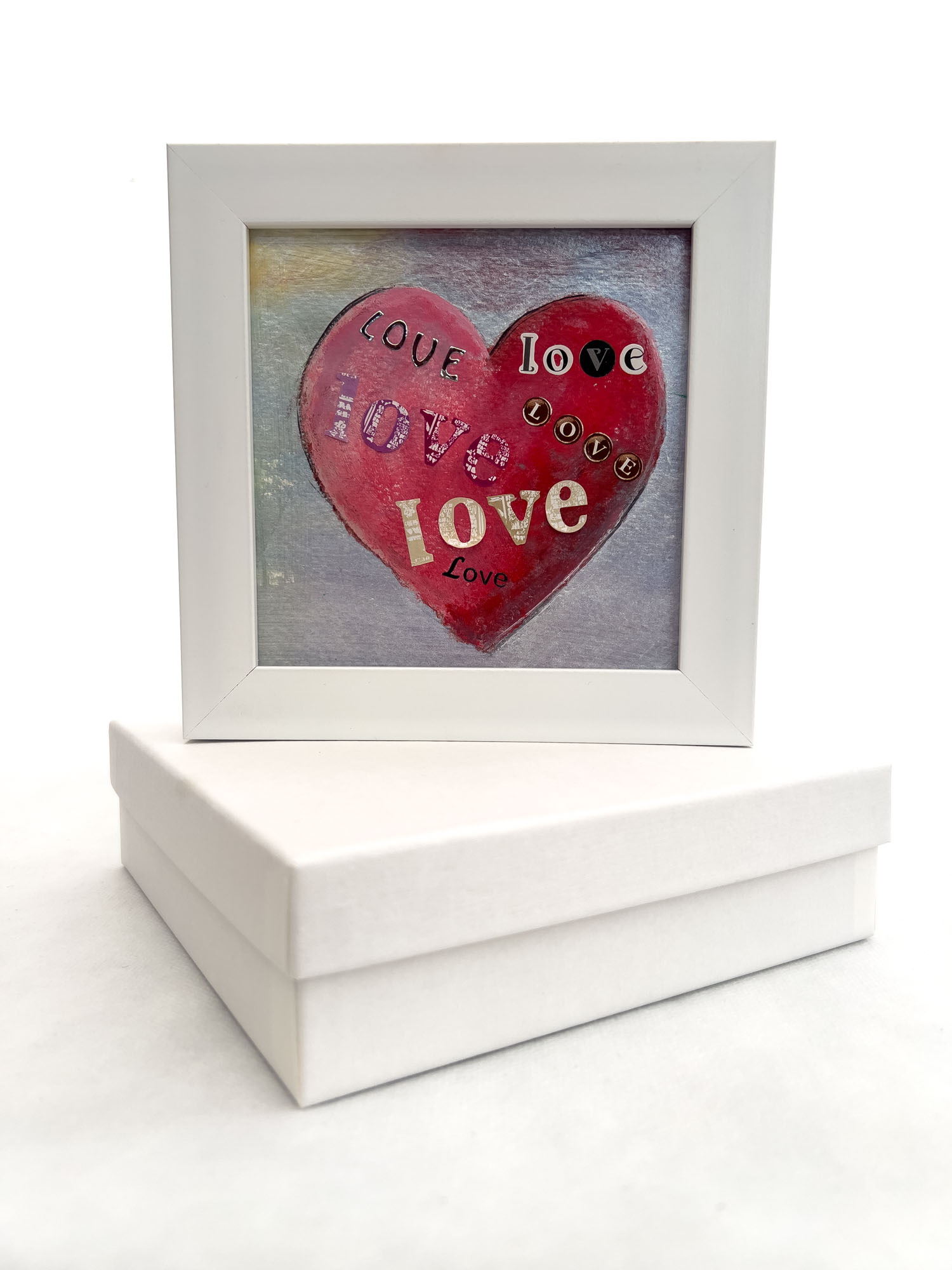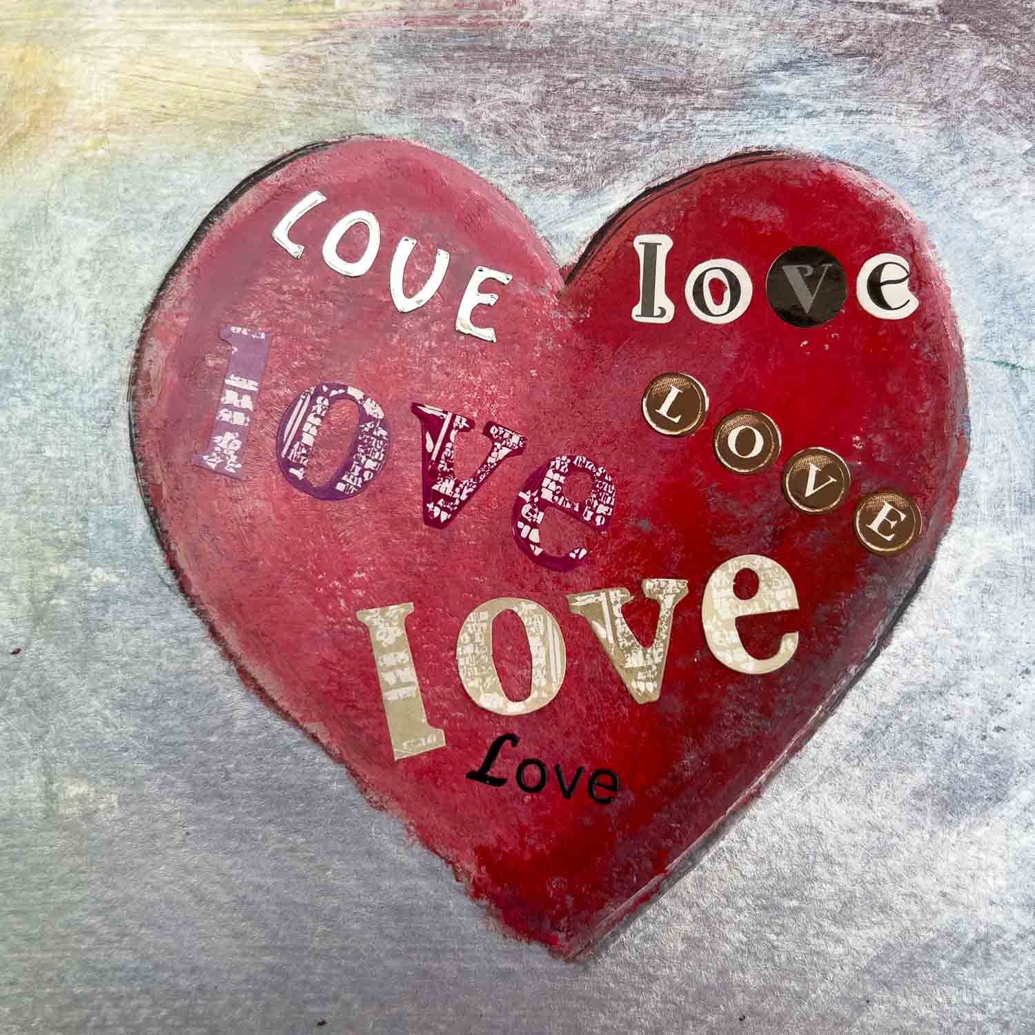 This heart is built from layers of colour, surface marks, and repeated words, creating a sense of rhythm and emphasis. The varied tones of red and soft neutrals give warmth, while the overlapping text reinforces the central theme without overpowering the image.