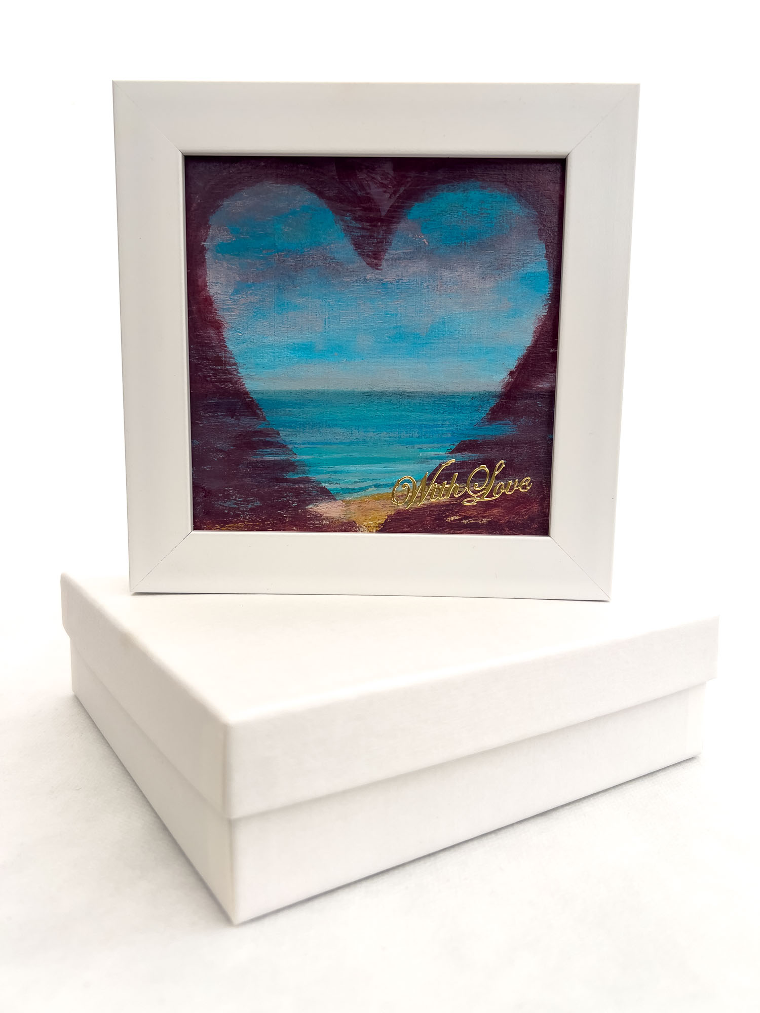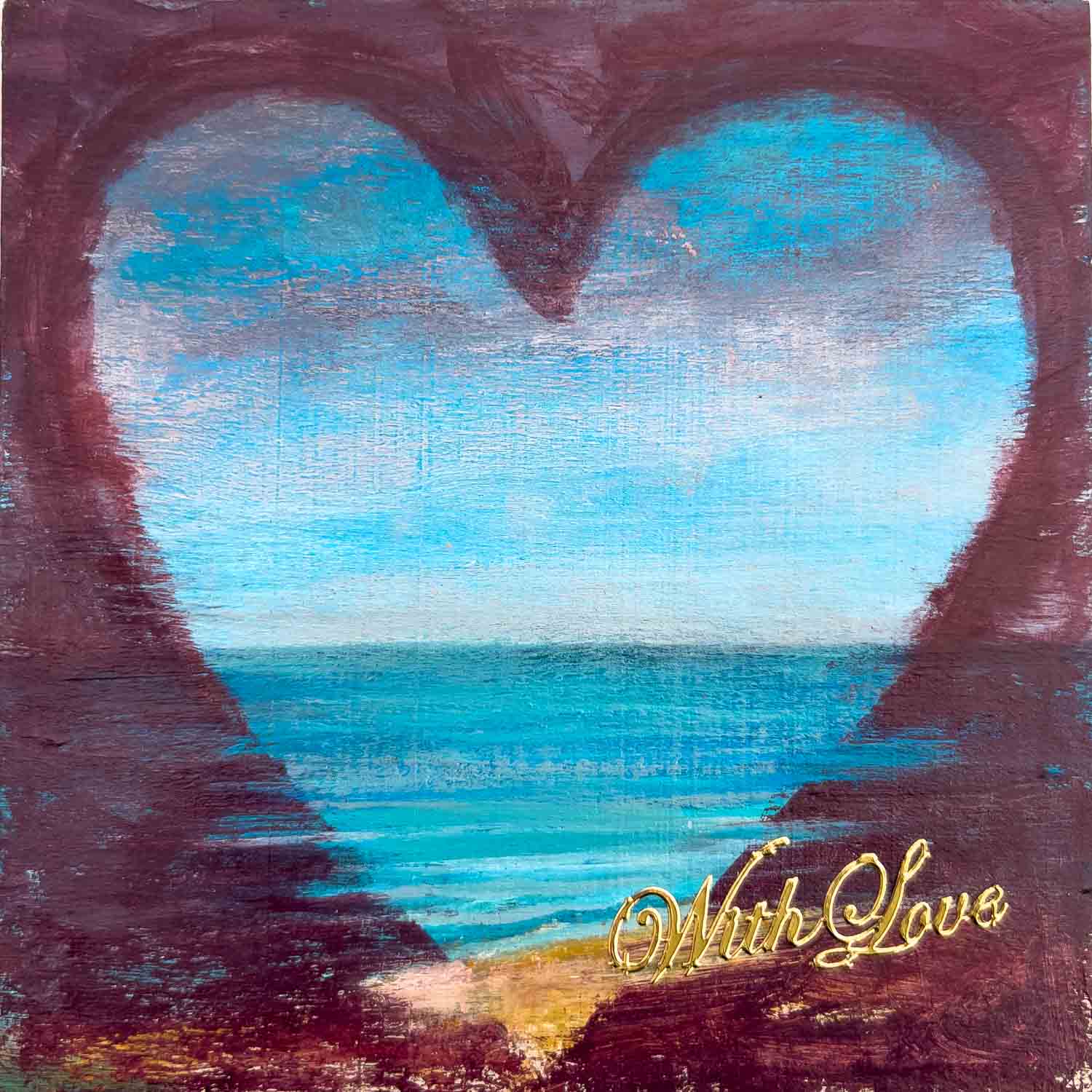 A calm coastal scene sits within the outline of a heart, where soft blues and gentle horizons suggest openness and stillness. The surrounding darker tones frame the lighter centre, drawing the eye inward and creating a sense of quiet refuge. A subtle gold signature adds a delicate finishing touch.