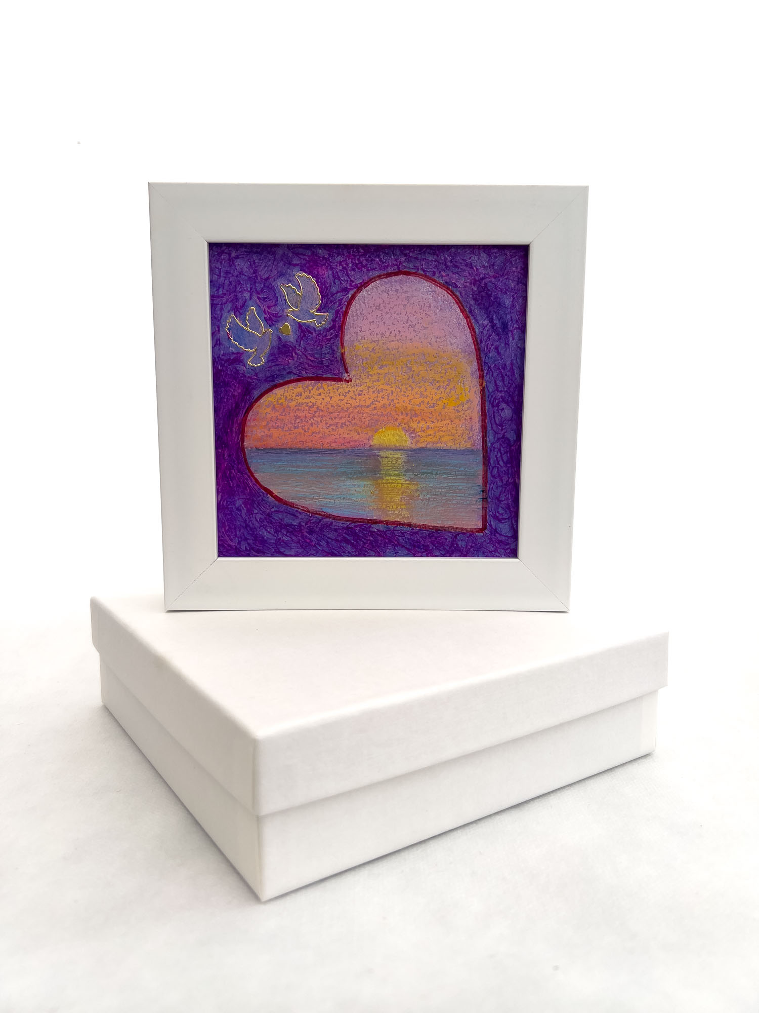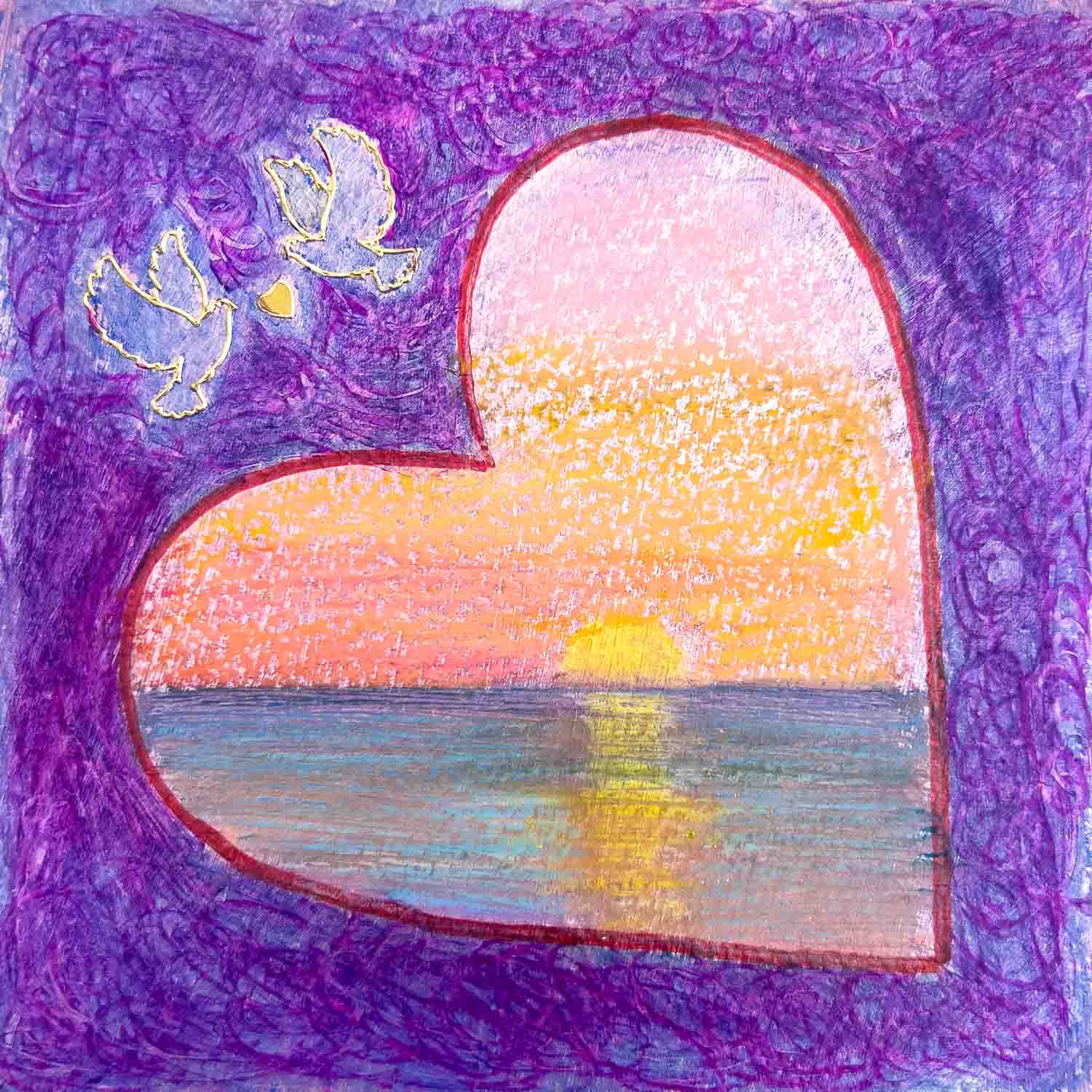 A soft sunset scene is held within the outline of a heart, where warm oranges and gentle pinks meet a calm horizon line. The glowing light reflects across the surface, evoking stillness, tenderness, and a sense of shared quiet moments. The heart becomes a window — both intimate and expansive.