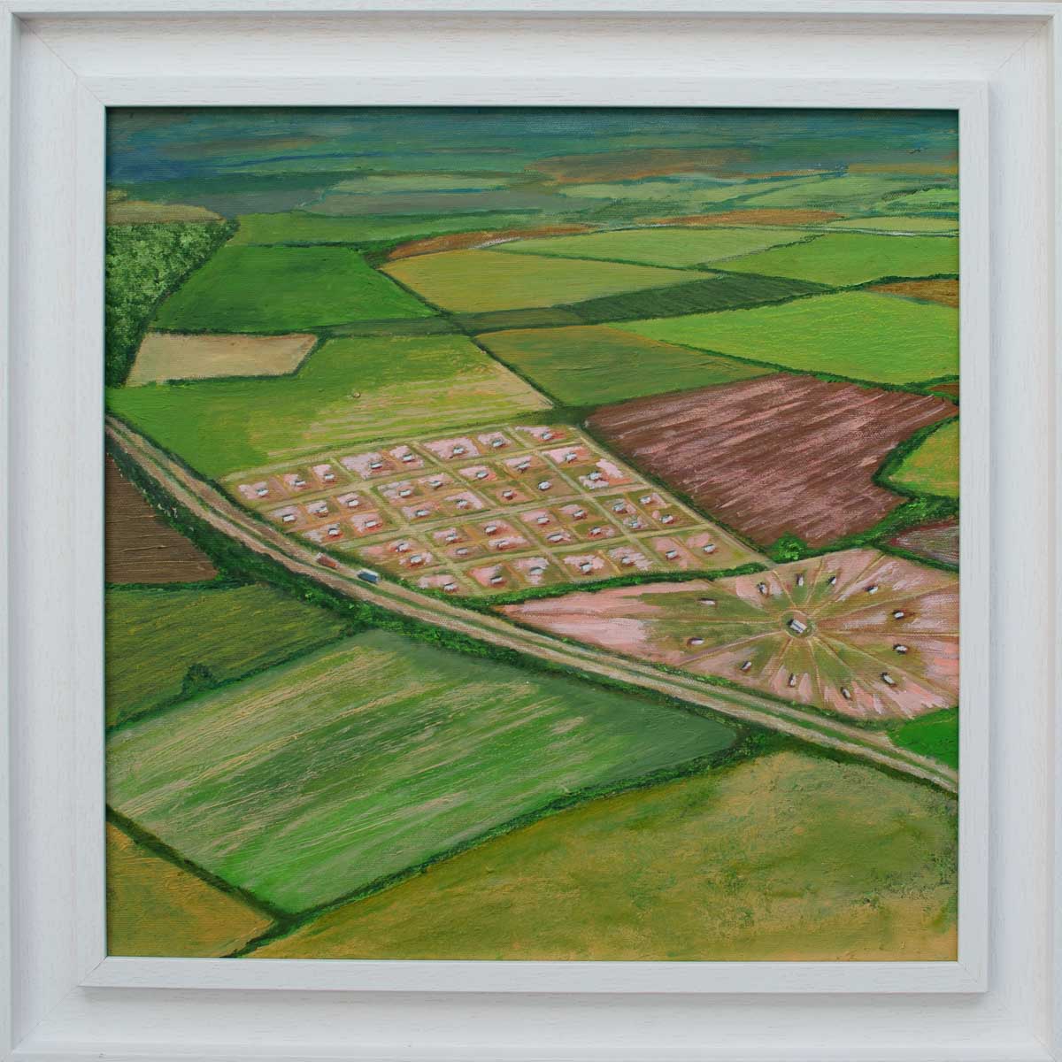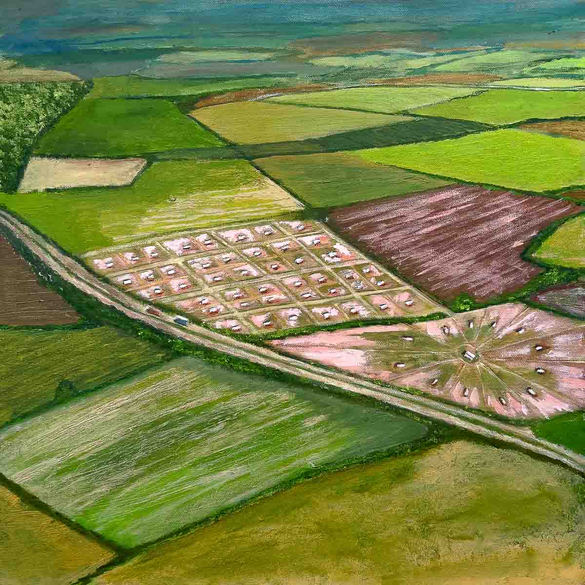 The artwork is an aerial landscape painting depicting a patchwork of agricultural fields.
