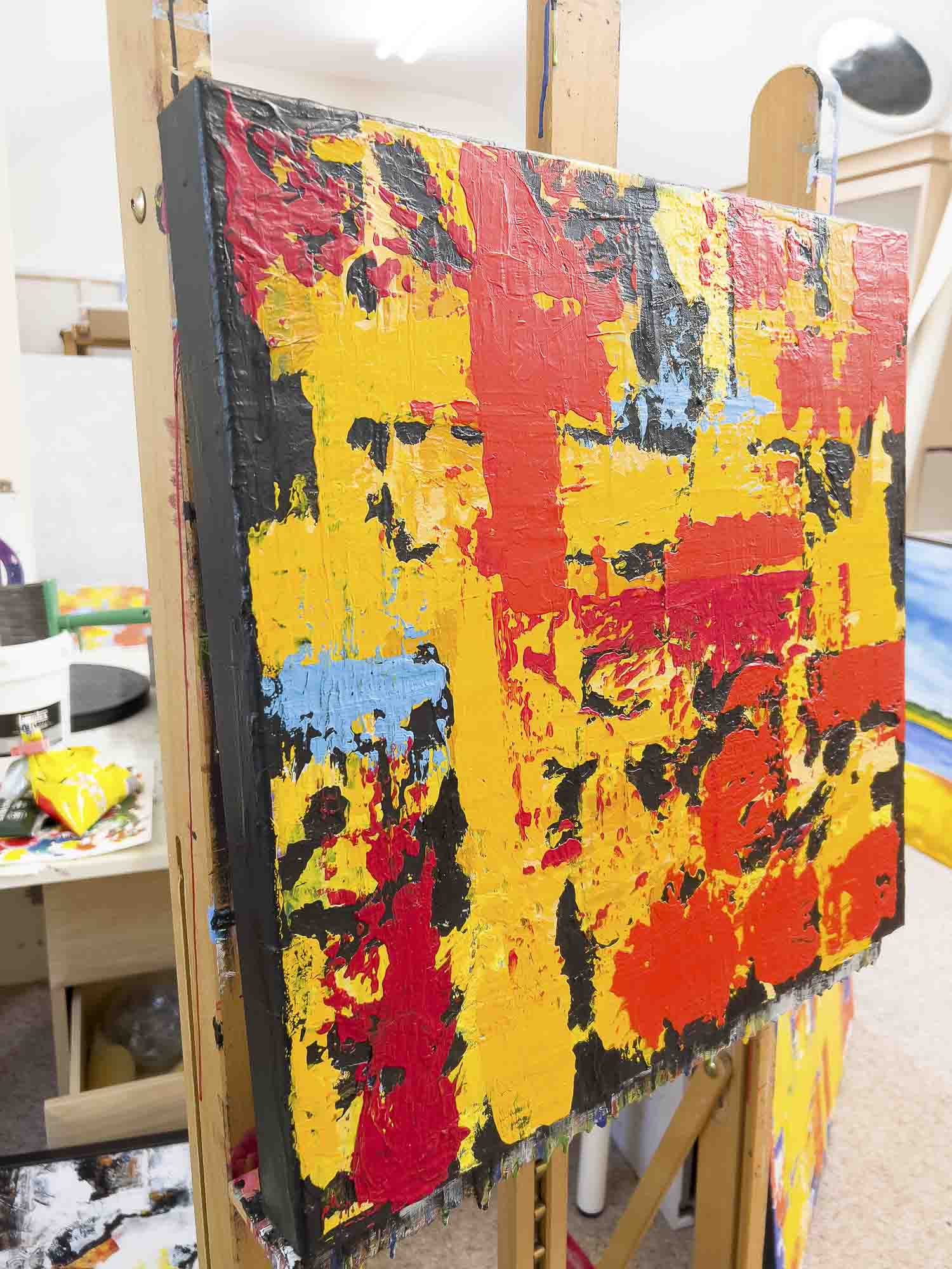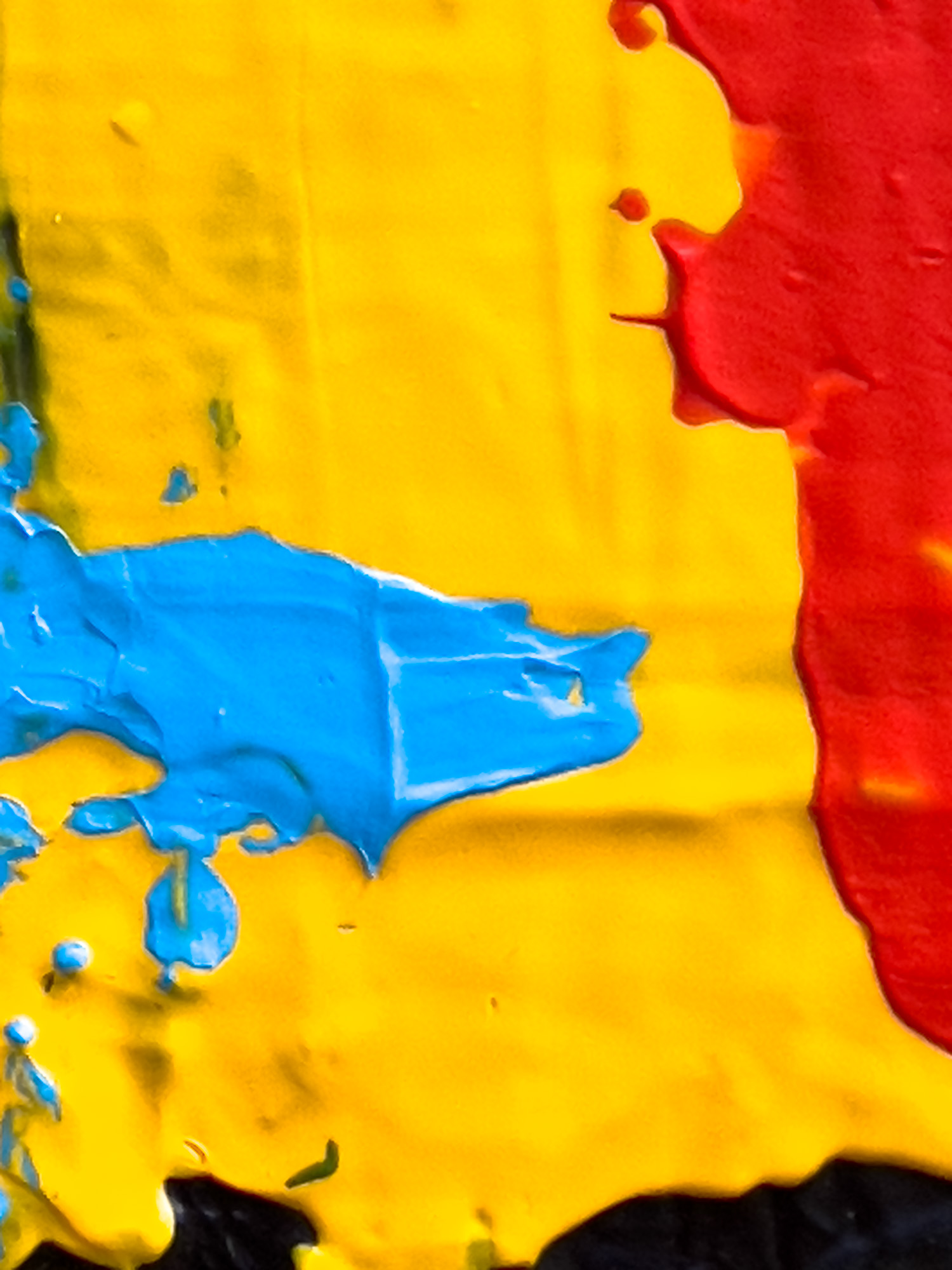 A vivid interplay of red, yellow, and black creates a surface alive with intensity. Patches of colour overlap and fracture, like glimpses caught in shifting focus, suggesting both clarity and distortion.