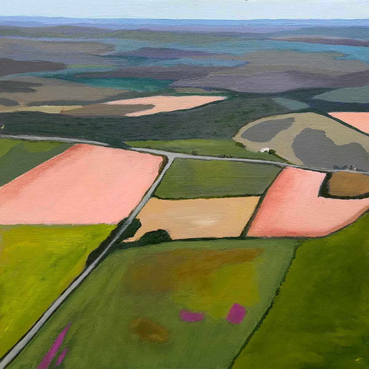 The painting presents a complex tapestry of fields, each section distinct yet interconnected, forming a mosaic of greens, yellows, and subtle hints of pinks. These patches are delineated by slender, dark lines that evoke the natural boundaries of roads and hedgerows, leading the eye across the undulating terrain.